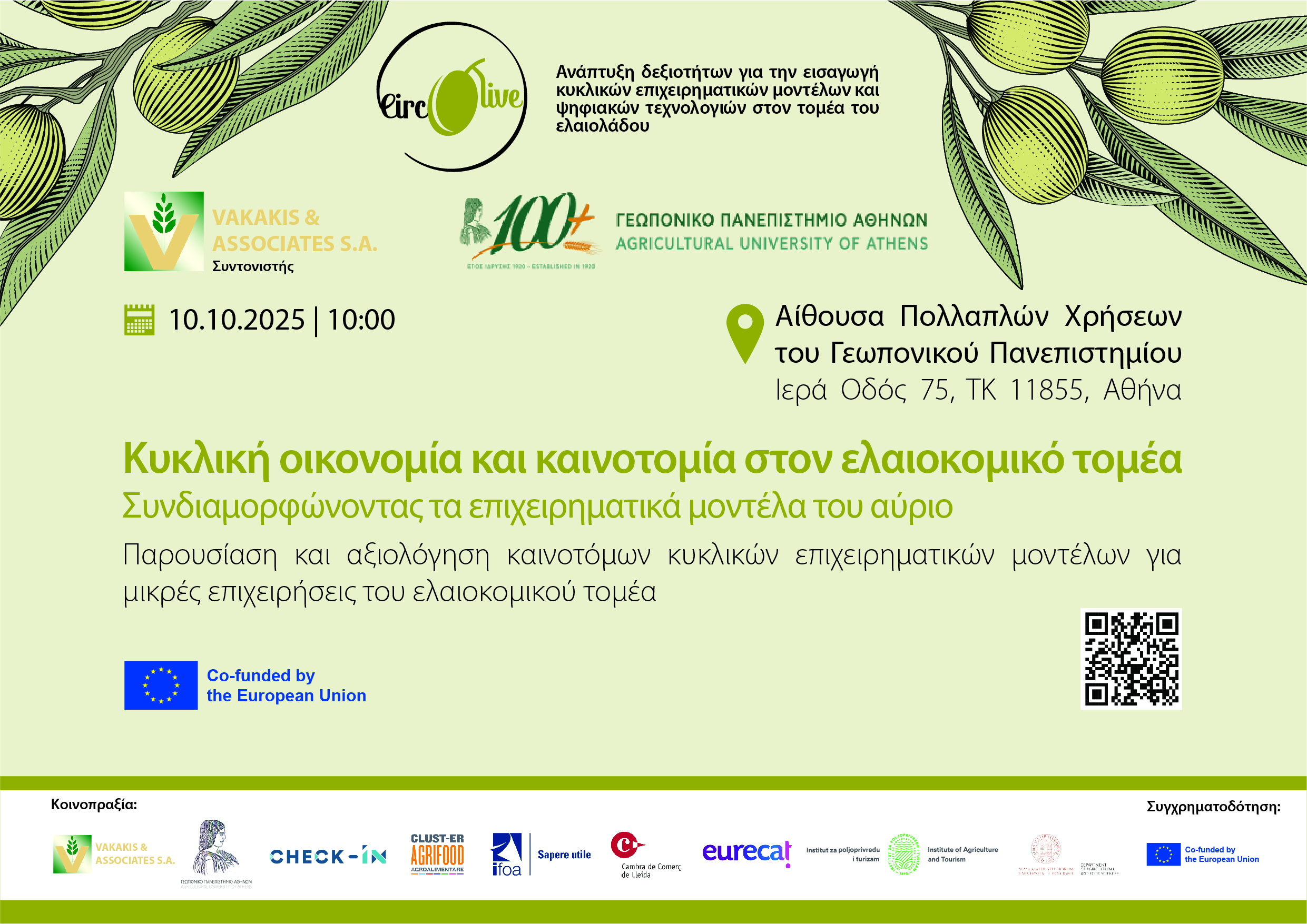 Το Γεωπονικό Πανεπιστήμιο Αθηνών σας προσκαλεί την Παρασκευή 10 Οκτωβρίου 2025, στις 10:00 π.μ., στην Αίθουσα Πολλαπλών Χρήσεων του Γεωπονικού Πανεπιστημίου Αθηνών, όπου θα πραγματοποιηθεί εργαστήριο για τη συνδιαμόρφωση επιχειρηματικών μοντέλων κυκλικής οικονομίας στον τομέα της ελαιοκομίας. Το εργαστήριο διοργανώνεται στο πλαίσιο του ευρωπαϊκού έργου CIRCOLIVE (ERASMUS+) από το Γεωπονικό Πανεπιστήμιο Αθηνών, σε συνεργασία με τον συντονιστή του έργου, Βακάκης και Συνεργάτες – Σύμβουλοι για Αγροτική Ανάπτυξη Α.Ε..