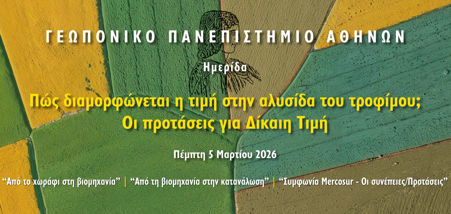 Το Γεωπονικό Πανεπιστήμιο Αθηνών σας προσκαλεί την Πέμπτη 5 Μαρτίου και ώρα 11:00 – 14:00 στην Ημερίδα με θέμα «Πώς διαμορφώνεται η τιμή στην αλυσίδα του τροφίμου; - Οι προτάσεις για Δίκαιη Τιμή», που θα πραγματοποιηθεί στο Συνεδριακό Κέντρο του Πανεπιστημίου (Ιερά Οδός 75, Αθήνα).