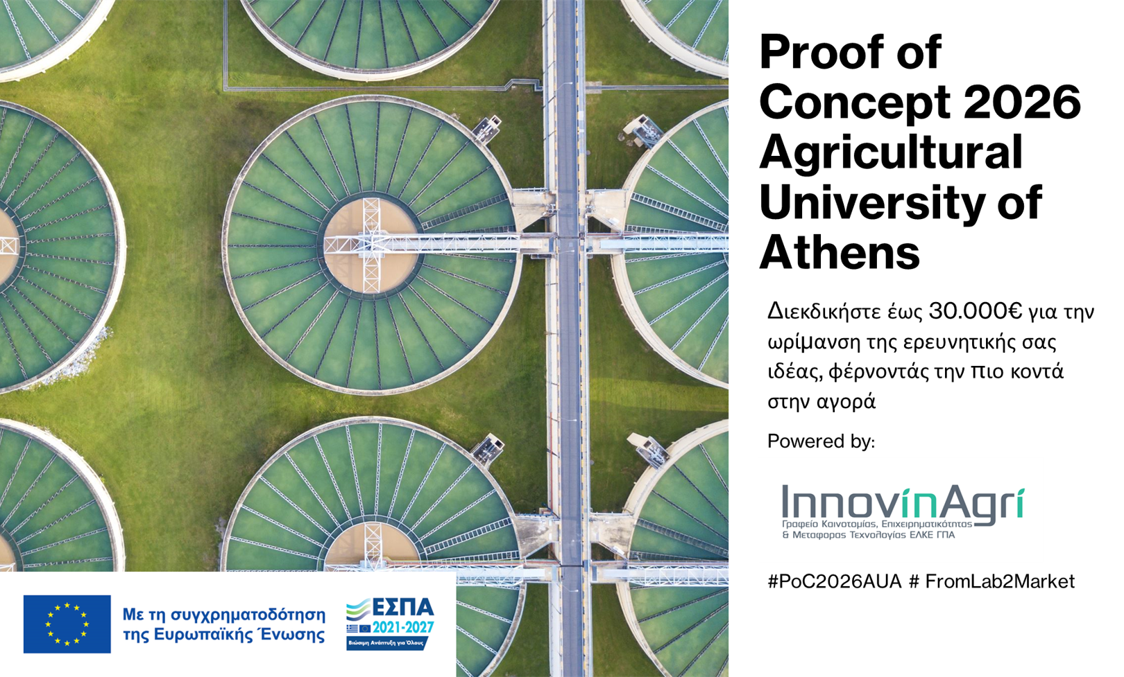 Το Γραφείο Καινοτομίας, Επιχειρηματικότητας και Μεταφοράς Τεχνολογίας ΕΛΚΕ ΓΠΑ – InnovinAgri ανακοινώνει τη νέα Δράση Proof of Concept – PoC AUA 2026, η οποία στοχεύει στην υποστήριξη ερευνητικών ιδεών με προοπτικές αξιοποίησης και σύνδεσης της έρευνας με την αγορά.