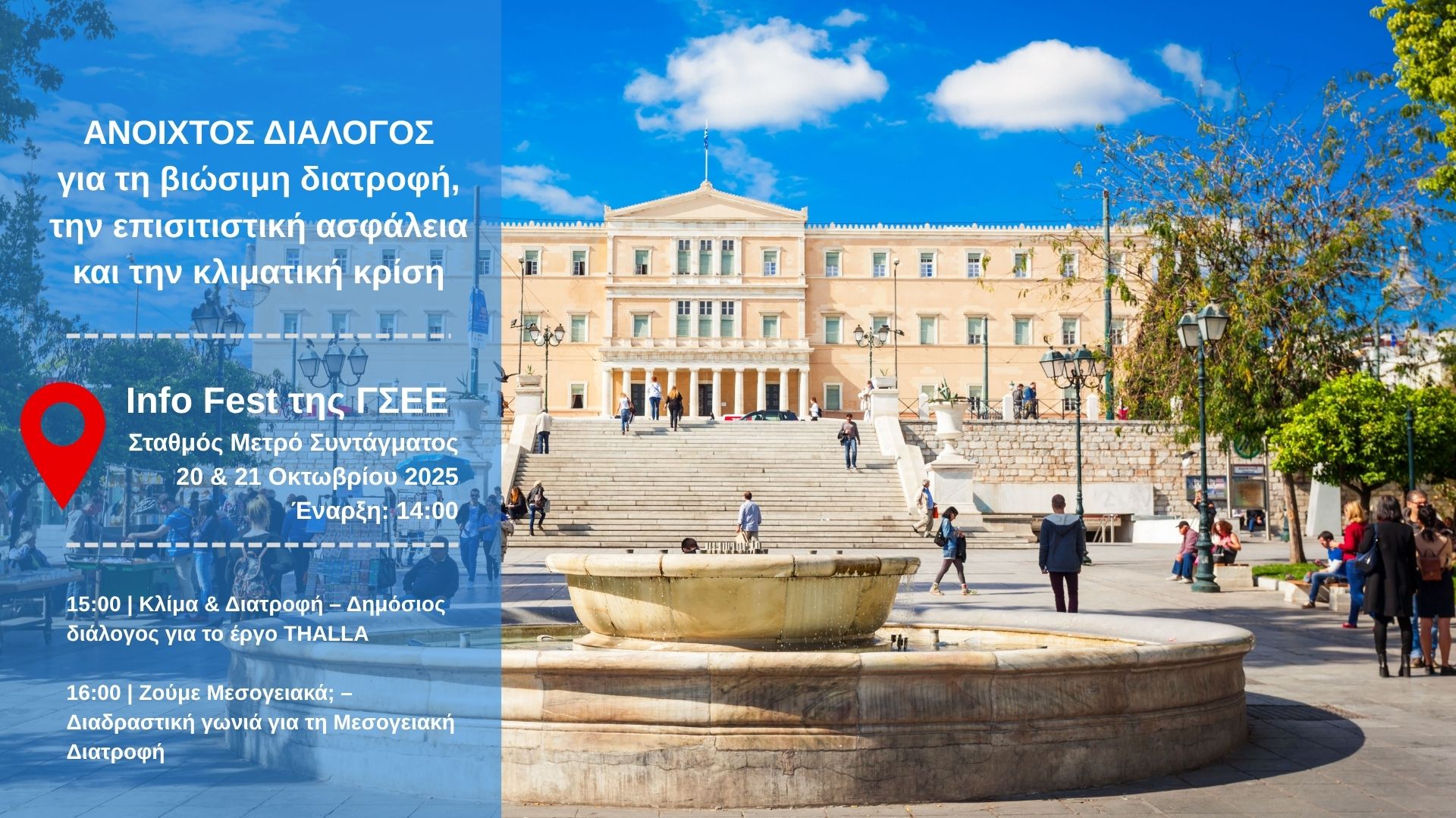 Στην Πλατεία Συντάγματος στην Αθήνα, 20 και 21 Οκτωβρίου 2025, το THALLA στήνει τη δική του διαδραστική γωνιά. Στο πλαίσιο του Info Fest της ΓΣΕΕ, στον εκθεσιακό χώρο του Μετρό Συντάγματος (έναρξη στις 14:00) το THALLA συστήνεται στο κοινό, εστιάζοντας στη βιώσιμη διατροφή, το κλίμα και την επισιτιστική ασφάλεια, με στόχο να προάγει τη μετάβαση σε ανθεκτικά, συμπεριληπτικά και δίκαια αγρο-διατροφικά συστήματα.
