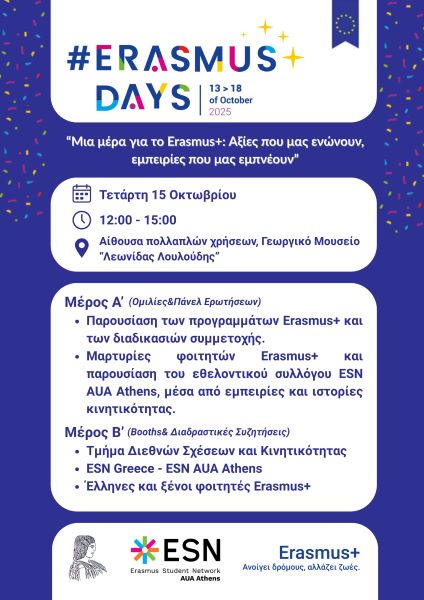 On Wednesday, October 15, the Department of International Relations and Mobility and ESN AUA Athens actively participated in the Erasmus Days 2025, organising an event dedicated to celebrating the Erasmus+ mobility programme and the European spirit. The aim of the conference was not only to inform and promote mobility programmes among students of the Agricultural University of Athens but also to connect the institution with the values of the European Union and to strengthen interaction between students, new volunteers and incoming students in a friendly and modern environment.
