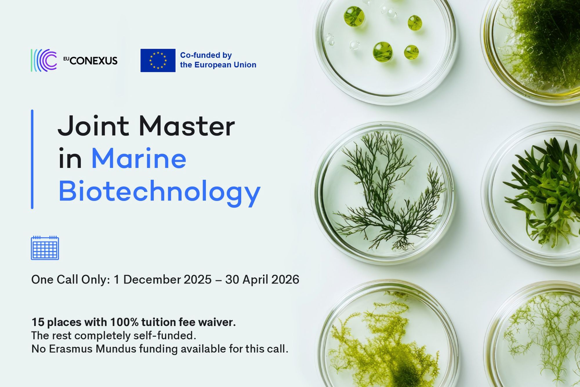 The Agricultural University of Athens and the European University for Smart Sustainable Urban Coastal Zone Management (EU-CONEXUS) invite students to apply for the Erasmus Mundus Joint Master's Degree Programme, titled Marine Biotechnology, for the academic year 2025-2026.