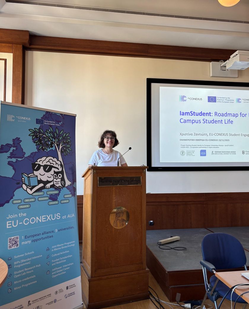 The programme continued with an address by Christina Zantioti, EU-CONEXUS Student Engagement Officer, who presented IamStudent: Roadmap for Inter-Campus Student Life. Her presentation illuminated the initiatives aimed at strengthening the EU-CONEXUS Student Identity and fostering meaningful student involvement in shared European activities.